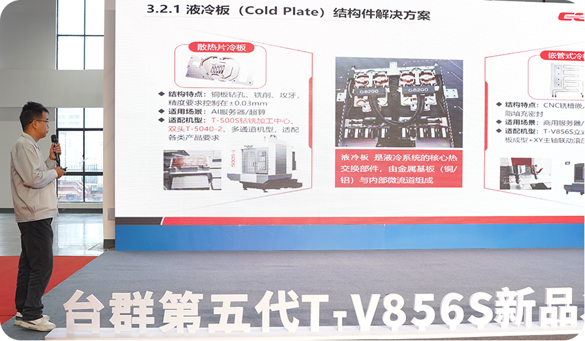随后,嘉宾参观了湖州制造车间及展厅,现场展示的AI液冷板、人形机器人曲面结构件等加工样品,直观呈现了第五代T-V856S在新能源、AI散热、人形机器人等新兴领域的工艺适配性,部分客户还就特定零件的加工工艺与技术工程师展开一对一沟通,技术团队结合实际案例提供了从设备选型到工艺优化的全流程建议。